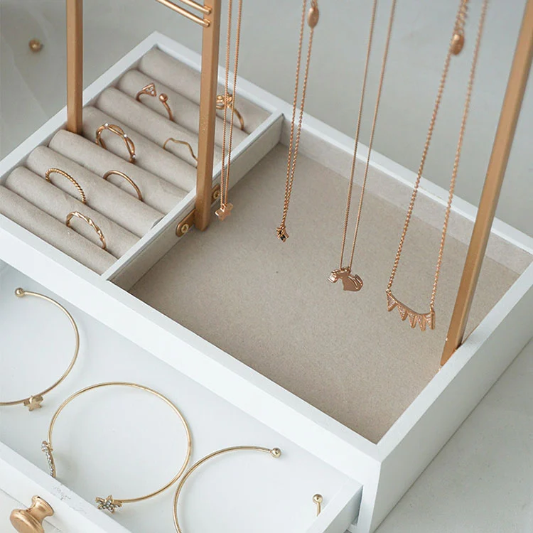 Area tampilan terbuka lapisan atas: Bingkai logam emas, cocok untuk menggantung kalung, anting, dan gelang. Mudah dilihat dan dapat diakses sesuai kebutuhan.
